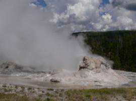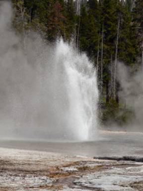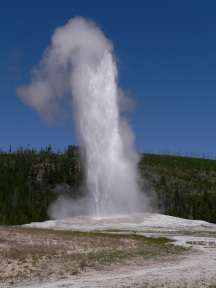 Old Faithful. The most predictable large geyser and certainly the best known. It now erupts approximately every 90 minutes. Before the 1959 earthquake, it erupted approximately every 60 minutes. |
